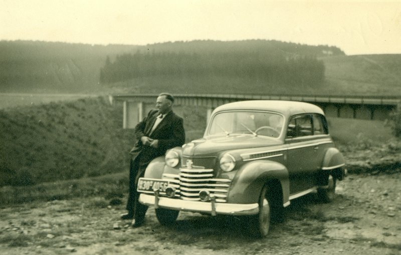 Wilhelm Hachmeister mit dem 1. Auto, 'Opel Olympia', Baujahr 1949
