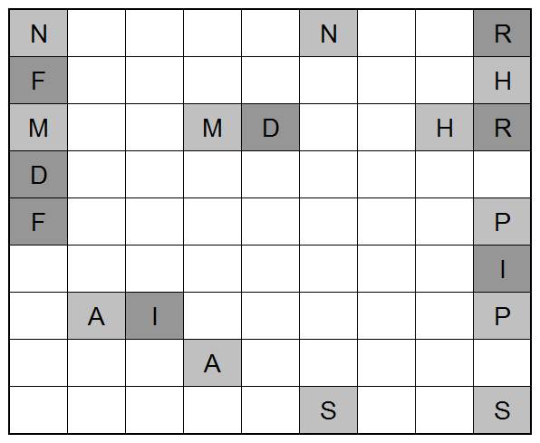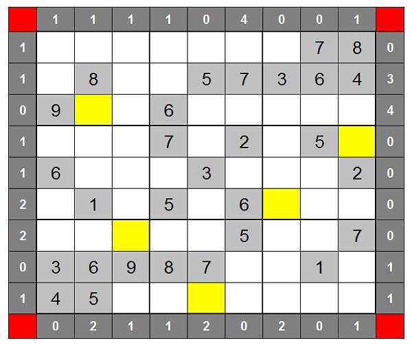 D - Aitana![]() Füllen Sie die leeren Felder aus. In jeder Zeile, in jeder Spalte und in jedem 3*3-Kästchen (dicker Rahmen) müssen jeweils alle Ziffern von 1 bis 9 stehen! Stellen Sie sich vor, alle Kästchen wären durchnummeriert (1, 2, 3, ...). Die Nummerierung ist von links nach rechts, von rechts nach links, von oben nach unten und von unten nach oben denkbar. Die weißen Zahlen außerhalb der Matrix geben an, wie viele Ziffern in der fertig ausgefüllten Matrix gleich ihrer Position sind (Treffer). Wenn also z.B. die vierte Ziffer von links eine 4 wäre, so wäre dies ein Treffer für den linken Rand. Wenn die dritte Ziffer von rechts eine 3 wäre, so wäre dies ein Treffer für den rechten Rand. |