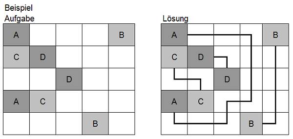 Verbinden sie jeweils die beiden Felder, die den gleichen Buchstaben haben, durch eine einzige, durchgehende Linie. Die Abschnitte eines Linienzugs verlaufen waagerecht oder senkrecht zwischen den Mittelpunkten der Felder. Dabei darf ein Feld nicht mehrfach durchlaufen werden. Die Verbindungslinien können sich daher auch nicht kreuzen. Arukone ist ein japanisches Logikrätsel, das erstmals von der japanischen Zeitschrift Nikoli veröffentlicht wurde. Arukone ist auch unter anderen Namen bekannt, dazu gehören: Number Link, Alphabet Connection, ABC Connection und Buchstabenbund. |