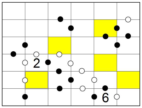 F - Punkte-Sudoku![]() In jeder Tabelle müssen die Ziffern von 1 bis 6 so eingetragen werden, dass in jeder Spalte und jeder Zeile jede der Ziffern genau einmal vorkommt. Befindet sich zwischen zwei Feldern ein schwarzer Kreis, so muss eine der beiden Ziffern genau das Doppelte der anderen Ziffer sein. Befindet sich zwischen zwei Feldern ein weißer Kreis, so muss eine der beiden Ziffern genau un eins größer sein als die andere Ziffer. Befindet sich kein Kreis zwischen zwei Ziffern, so darf auch keine der beiden Eigenschaften zutreffen. |