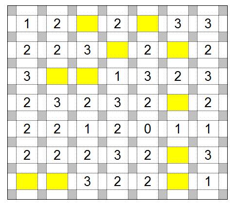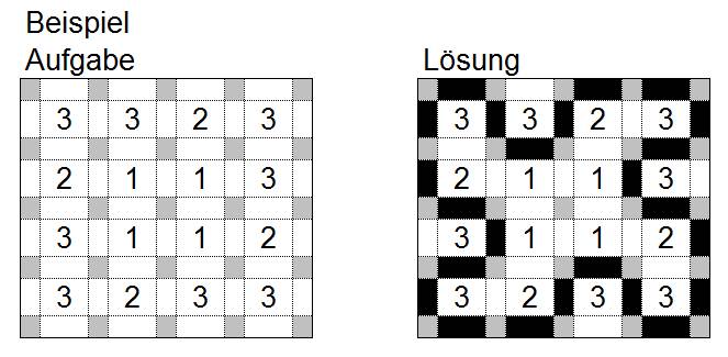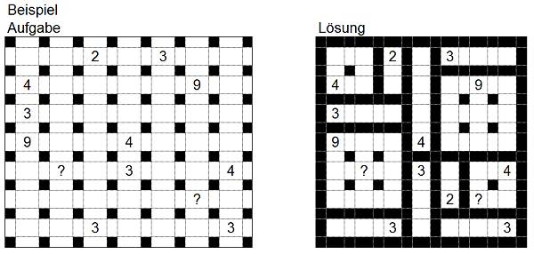 Hier soll eine einzige geschlossene Linie entstehen, die weder Kreuzungen noch Verzweigungen aufweist. Linienabschnitte müssen dabei immer von Punkt zu Punkt verlaufen - aber nicht diagonal. Die Zahlen geben dabei an, wie viele Linien um das jeweilige Feld einzuzeichnen sind. Bei Feldern, in denen keine Zahl steht, müssen Sie dies selbst herausfinden - es bedeutet keinesfalls, dass dort keine Linien entlanglaufen.