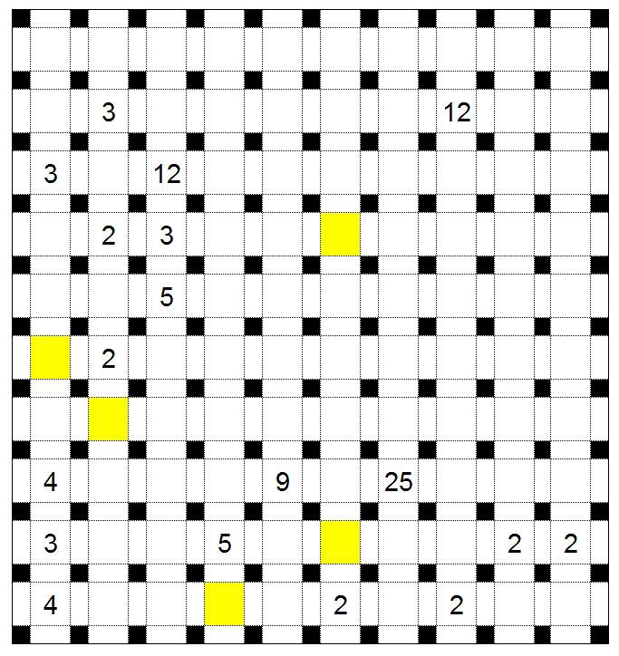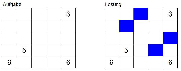 Finden Sie die blauen Quadrate! Beachten Sie dabei folgende Regeln: Blaue Quadrate dürfen aneinandergrenzen - aber höchstens an den Eckpunkten. Alle weißen Quadrate bilden einen zusammenhängenden Bereich. Zahlenfelder sind immer weiß. Die Zahl in einem Quadrat gibt an, wie viele weiße Quadrate aus waagerecht und senkrecht erreicht werden können. (Dabei wird das Quadrat, auf dem die betreffende Zahl steht, mitgezählt.)