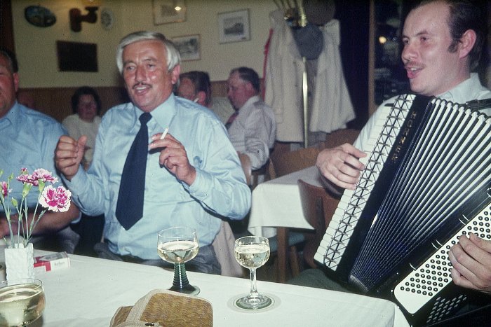 Dieser Tisch ist der Ursprung der Stimmung. Bernd Diekmann mit dem Akkordeon und Heinrich Schaper in Hochform.