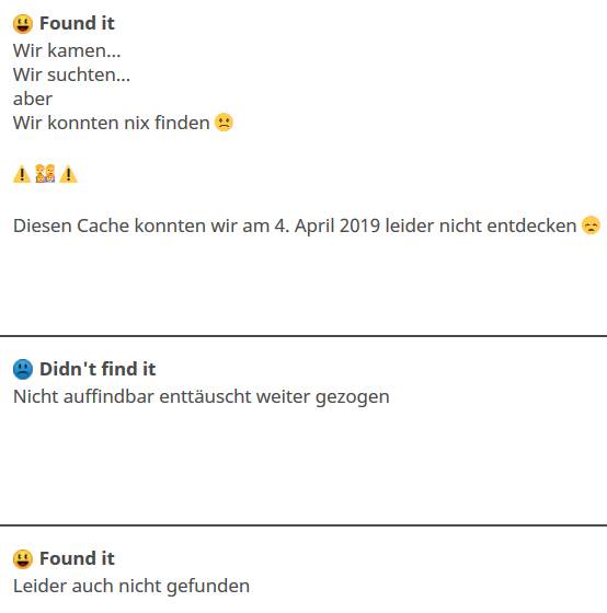 Eine Runde voller Kurz-Multis! So etwas hatten wir noch nie. Und dann war da noch die Andeutung des Owners die Runde in diesem Jahr archivieren zu wollen. Also mussten Matscha48 und ich die Sache angehen. Und wir wurden nicht enttäuscht. Schöne, abwechslungsreiche Rätsel und tolle Bastelarbeiten! Mit mehr oder weniger Aufwand konnten wir alle Dosen finden. Okay, an einigen Stellen waren die Zugänge doch ziemlich zugewachsen. Aber alles in allem eine Runde, die ich nur empfehlen kann!