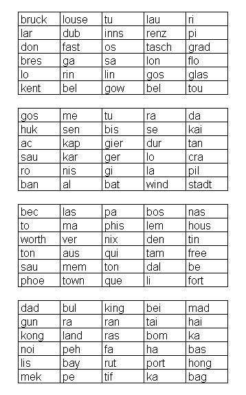 In den vier Tabellen sind jeweils 15 Städte versteckt, deren Namen sich aus zwei Teilen zusammensetzen. In jeder Tabelle steckt eine Stadt, die nicht zu dem gleichen Kontinent wie die anderen Städte gehört. Es ist die alphabetisch dritte der vier Städte gesucht!