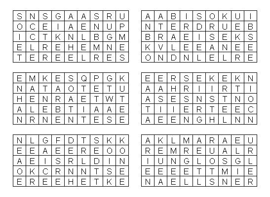 Es sind Wörter mit fünf Buchstaben gesucht. Zu jedem Block mit acht Aufgaben gehört eine Tabelle. Die Tabellen stehen nicht unbedingt in der gleichen Reihenfolge wie die Aufgabenblöcke! Der erste Buchstabe des Wortes steht in der ersten Zeile, der zweite in der zweiten Zeile .... In jedem Kästchen bleiben fünf Buchstaben übrig. Sie ergeben das Lösungwort! Alle Lösungswörter gehören zu einem Thema. Es ist das alphabetisch zweite Wort gesucht! |