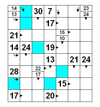 Dieses Rätsel ist wie ein Kreuzworträtsel zu raten. Es ist darauf zu achten, dass sich beim Eintragen der Ziffern die vorgegebenen Summen waagerecht und senkrecht ergeben. Es dürfen nur Ziffern von 1 bis 9 verwendet werden. Sie müssen in 'wertaufsteigender' Reihenfolge ausgefüllt sein und in jeder Rechenoperation darf sich keine Zahl wiederholen. So ist z.B. 135 erlaubt, 153 aber nicht!
