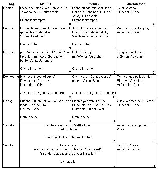 In dem Speiseplan stecken sieben inhaltliche Fehler. Markieren Sie die fehlerhaften Kästchen und fügen Sie die fetten Buchstaben in den markierten Kästchen zu dem gesuchten Lösungswort zusammen.