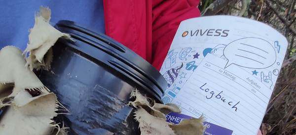 Es hat dann doch etwas gedauert, bis wir uns in die Bedienung der Cartridge eingearbeitet haben. Aber es lief dann zunehmend besser. Nach 90 Minuten konnten wir uns in das schöne Logbuch eintragen. Der Cache hat uns sehr gut gefallen. Ich habe natürlich eine blaue Schleife vor Ort gelassen. DFDC!