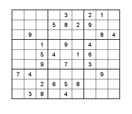 Füllen Sie die leeren Felder aus. In jeder Zeile, in jeder Spalte und in jedem 3*3-Kästchen (dicker Rahmen) müssen jeweils alle Ziffern von 1 bis 9 stehen! Die Lösungszahl ist die Zahl, die sich aus den neun Zifferm der mittleren Zeile ergibt.