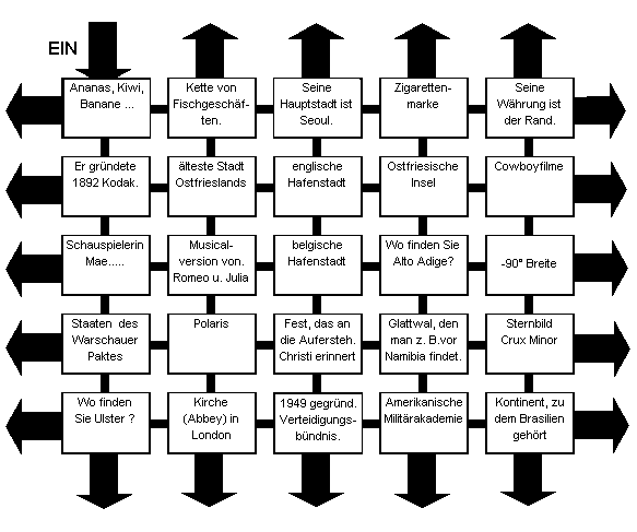 Finden Sie den richtigen Weg durch das Labyrinth der Fragen. Jedes Feld enthält eine Frage, deren Antwort entweder Nord, Ost, Süd der West enthält. Diese Himmelsrichtung ist auch Ihre Zuganweisung, die Sie in das Nachbarfeld bringt. Wenn Sie aus dem Gitter geraten, treten Sie am anderen Ende derselben Reihe oder Spalte wieder ein. Es werden alle Felder erreicht! Die Gesamtlösung ist die Lösung des Feldes, das Sie als erstes zweimal betreten!