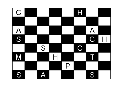 Die Buchstabenplättchen auf den Schachbrettern sind von ihrer eigentlichen Position verschoben worden. Jedes Plättchen hat einen Springerzug (z.B. 2 hoch, 1 rechts) gemacht.