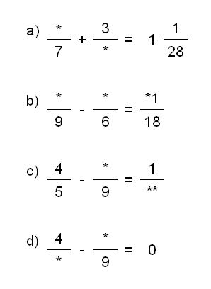 In den Gleichungen a bis d fehlen jeweils mehrere Ziffern. Für jeden Stern soll eine Ziffer gesetzt werden.