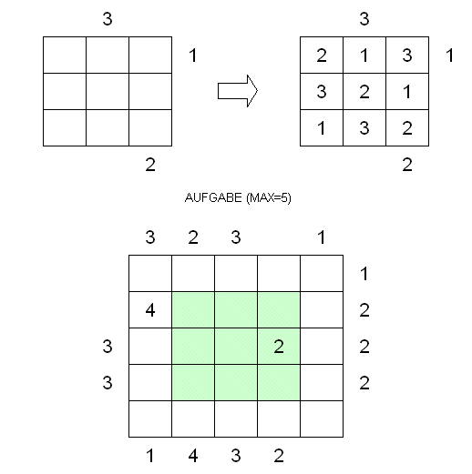 Jedes Feld des Diagramms ist mit einem Wolkenkratzer bebaut. Die Wolkenkratzer haben unterschiedliche Höhen, von 1 (niedrig) bis MAX (hoch). Die Zahlen rund um das Diagramm geben an, wie viele Gebäude man sieht, wenn man von der jeweiligen Seite in die betreffende Zeile, bzw. Spalte hineinblickt. Ein Gebäude ist nur dann sichtbar, wenn alle Gebäude davor niedriger sind.