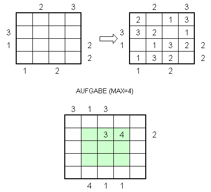 In jeder Zeile und Spalte des Quadrates kommt jede Ziffer von 1 bis MAX genau einmal vor. Gegebenenfalls bleiben einige Felder frei. Eine Ziffer am Rand des Quadrates gibt an, welche Ziffer man 'sieht', wenn man aus der entsprechenden Zeile oder Spalte in das Quadrat 'hineinblickt'.