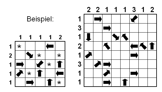 Wo stehen die Sterne? Die Zahlen nennen die Summe der Sterne in jeder Reihe und Spalte. Auf jeden Stern muss mindestens ein Pfeil zeigen, und jeder Pfeil muss mindestens auf einen Stern zeigen. Wie viele Sterne stehen in den beiden Diagonalen?