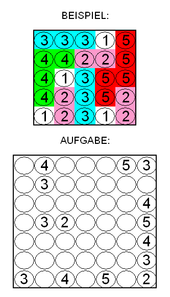 Die Zahlen von 1 bis 5 sind so in die leeren Kreise einzutragen, dass jede Zahl Teil eines Bereichs ist! Jeder Bereich hat so viele waagerecht und senkrecht aneinander hängende Kreise wie der Wert der Zahl aussagt. Zwei Bereiche mit der gleichen Zahl dürfen sich nur diagonal berühren!