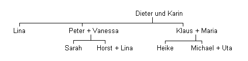 | Mein Vater ist 66 Jahre alt. Seine Name lautet __________ . Meine __________ ist 59 Jahre alt. Ihr Name ist __________. Ich habe eine __________. Sie ist 35. Mein _________ ist 40. Er ist verheiratet und hat zwei __________. Ich habe auch zwei __________. Meine __________ heißt __________. Sie ist 17 Jahre alt. Der Name meines __________ lautet __________. Seine __________ heißt __________, genau wie meine __________. |