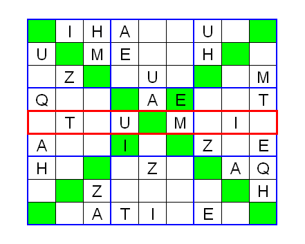 Jeder Buchstabe des Begriffs MATHEQUIZ muss in jeder Reihe, jeder Spalte und in jedem der neun Unterquadrate sowie in den beiden Diagonalen genau einmal auftauchen!
