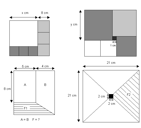 Die Zahlenwerte für x, y, F1 und F2 sollen addiert werden. Bei allen rechteckigen Teilflächen der beiden oberen Figuren handelt es sich um Quadrate!