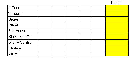 aller fünf Würfel) und Yazy (3-3-3-3-3).