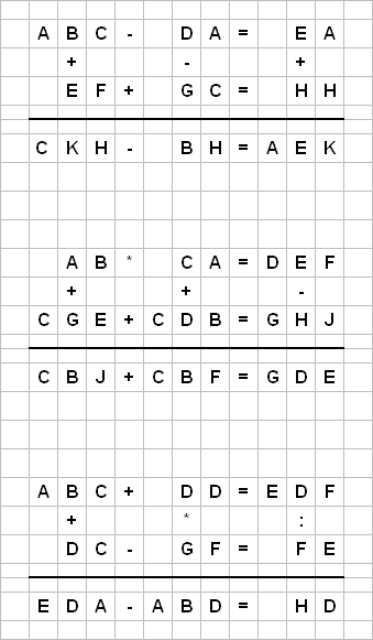 Ersetzen Sie die Buchstaben durch Ziffern im Bereich von 0 bis 9. Die Lösungswörter erhalten Sie, indem Sie die der Reihe nach die folgenden Zahlen umsetzen: 86206, 5436 und 9684.