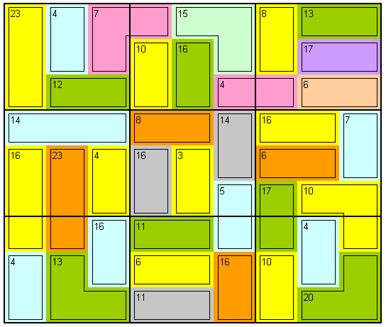 Hier ist noch eine Sudoku Variante. Die Ziffern sind nach den üblichen Regeln einzutragen, allerdings besteht die Vorgabe aus den Ziffernsummen in den farblich zusammenhängenden Feldern.