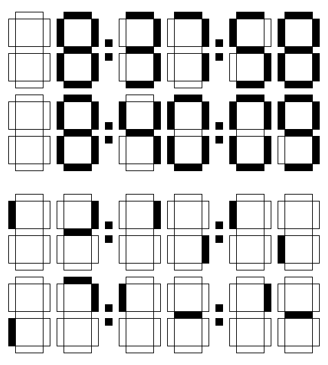 Die dritte Reihe zeigt die Zeit, als ein zweites Ereignis begann, die vierte Reihe zeigt die Zeit, als das Ereignis endete. Das Display ist durch einen technischen Defekt zerstört, sodass einige Teile der Ziffern nicht mehr lesbar sind. Die Art des Defektes kann am Anfang und am Ende verschieden sein. Bei der Anzeige der Startzeit sollten eigentlich 28 Felder (ohne Doppelpunkte) aufleuchten. Bei der Zielzeit sollten es ebenfalls 28 Felder sein.