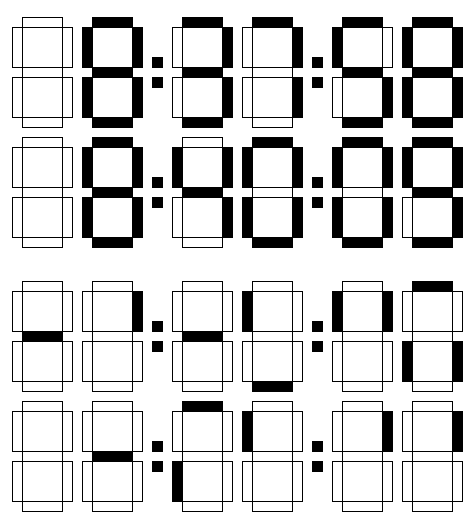 Die dritte Reihe zeigt die Zeit, als ein zweites Ereignis begann, die vierte Reihe zeigt die Zeit, als das Ereignis endete. Das Display ist durch einen technischen Defekt zerstört, sodass einige Teile der Ziffern nicht mehr lesbar sind. Die Art des Defektes kann am Anfang und am Ende verschieden sein. Bei der Anzeige der Startzeit sollten eigentlich 29 Felder (ohne Doppelpunkte) aufleuchten. Bei der Zielzeit sollten es 26 Felder sein.