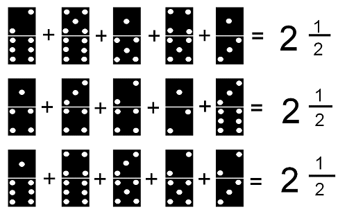 Man nehme aus einem Dominospiel alle Steine heraus, deren beide Hälften die gleiche Anzahl Augen enthalten (Pasche) und die Steine, die nur auf einer Hälfte Augen haben. Die übrigen 15 Steine kann man als Brüche betrachten und sie so in drei Reihen aufstellen, dass die Summe der Brüche in jeder Reihe 2,5 beträgt.