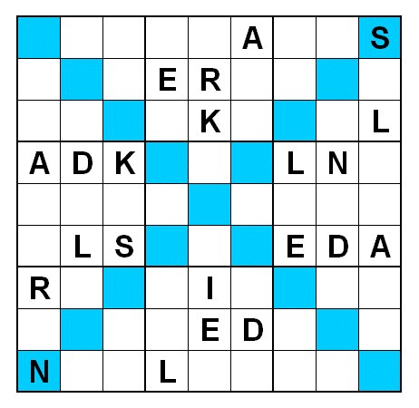 Jeder Buchstabe des Begriffs LANDKREIS muss in jeder Reihe, jeder Spalte und in jedem der neun Unterquadrate sowie in den beiden Diagonalen genau einmal auftauchen!