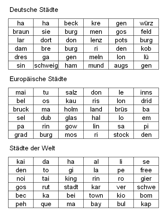 In den drei Tabellen sind jeweils 18 Städte versteckt, deren Namen sich aus zwei Teilen zusammensetzen. Zwei der 18 Städte gehören eigentlich in eine andere Tabelle. Es ist die Stadt unter den sechs Außenseitern gesucht, die in der alphabetischen Reihenfolge der sechs Städte auf Position 4 gehört!