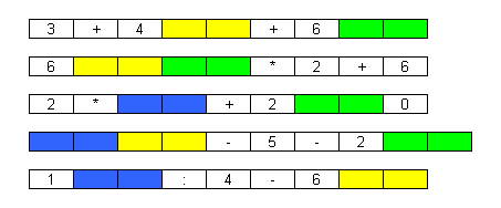 Haben Lücken die gleiche Farbe, gehört dort hinein auch jeweils die gleiche Zeichenfolge (Ziffer, +, -, *, /).