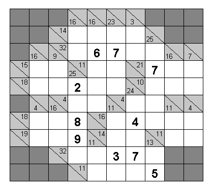 Platzieren Sie die Ziffern von 1 bis 9 in die leeren Felder. Die Summe eines jeden horizontalen oder vertikalen Zahlenblocks ist immer vorgegeben. Jede Ziffer darf höchstens einmal pro Block verwendet werden.