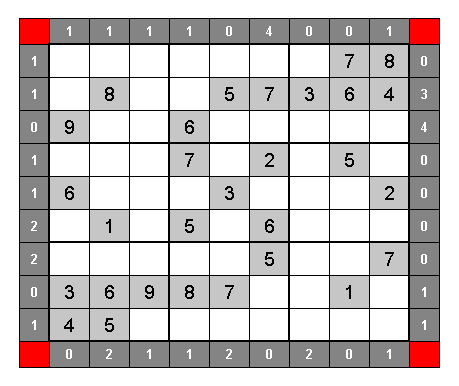 Die weißen Zahlen außerhalb der Matrix geben an, wie viele Ziffern in der fertig ausgefüllten Matrix gleich ihrer Position sind (Treffer).