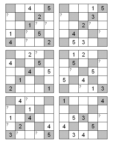 Magic Squares (Mini-Sudoku) gab es schon lange, bevor Sudoku populär geworden ist. Die Regeln sind ähnlich wie beim Sudoku. In jeder Zeile oder Spalte muss jede Ziffer (von 1 bis 5) genau einmal vorkommen. Dies gilt auch für die beiden grau unterlegten Diagonalen.