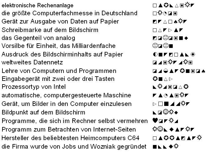 Finden Sie die EDV-Begriffe. Für jedes Zeichen muss ein bestimmter Buchstabe eingesetzt werden. Vier Buchstaben des Alphabets gehören zu keinem Zeichen. Diese vier Buchstaben sind gesucht.