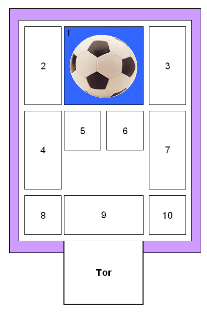 Die Teile sollen so verschoben werden, dass der Ball ins Tor kommt. Es darf aber keines der anderen Teile die Torlinie überschreiten. Wie viele Züge sind mindestens nötig?