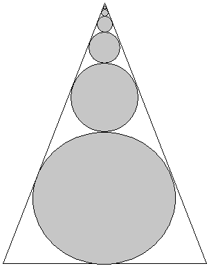 Ich zeichne in einen Kreis das größtmögliche gleichseitige Dreieck und in dieses Dreieck den Inkreis. In diesen Kreis zeichne ich jetzt das größtmögliche Dreieck und darein wieder den Inkreis. Dieses Prinzip setze ich bis ins Unendliche fort. Wieviel Prozent der ursprünglichen Kreisfläche macht dann der geschwärzte Bereich aus? In ein gleichschenkliges Dreieck mit den Seitenlängen 13, 13 und 8 Zentimeter ist der Inkreis eingezeichnet und eine unendliche Folge weiterer Kreise, die jeweils die beiden gleichen Schenkel des Dreiecks und den nächstgrößeren und nächstkleineren Kreis berühren. Wie groß (in cm) ist die Summe der Umfänge aller Kreise? |