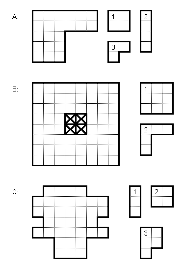 In die untenstehenden Figuren A, B und C sind so wenig wie möglich Felder einzufügen, mit denen man verhindern kann, dass die kleinen Ziffern-Figuren in die Buchstaben-Figuren gelegt werden können. Die Teile müssen immer ganze Felder abdecken. Drehungen sind erlaubt.