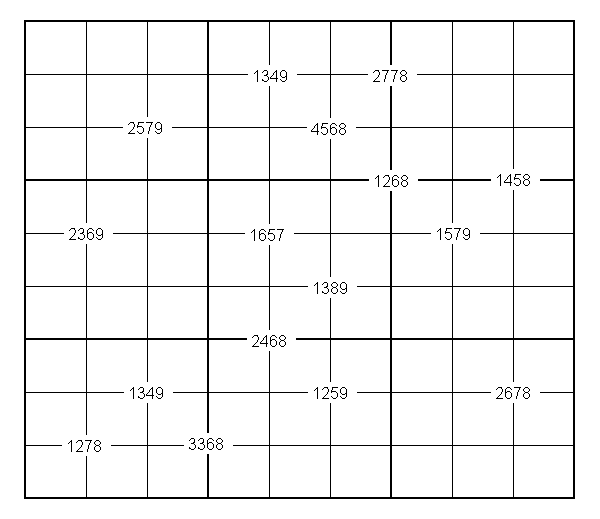 Es gelten die üblichen Sudoku-Regeln. Aber anstelle einzelner Zahlen sind Zahlengruppen vorgegeben: