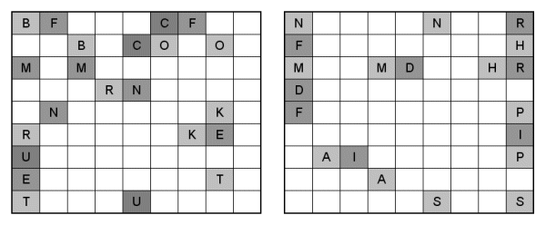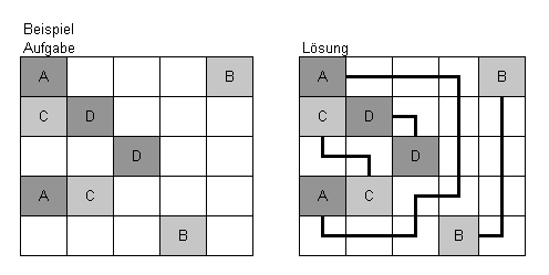 | Verbinden sie jeweils die beiden Felder, die den gleichen Buchstaben haben, durch eine einzige, durchgehende Linie. Die Abschnitte eines Linienzugs verlaufen waagerecht oder senkrecht zwischen den Mittelpunkten der Felder. Dabei darf ein Feld nicht mehrfach durchlaufen werden. Die Verbindungslinien können sich daher auch nicht kreuzen. |