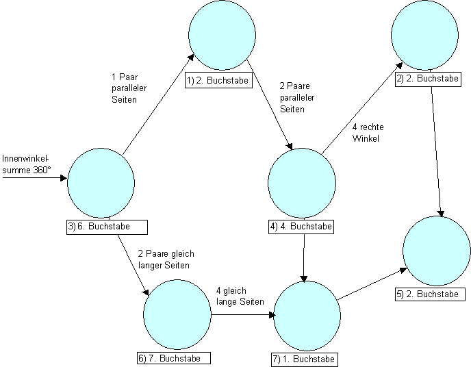 Schreiben Sie die Namen der Vierecke in die zugehörigen Kreise. Dabei sollen die Vierecke (Allgemeines Viereck, Drachen, Parallelogramm, Quadrat, Raute, Rechteck, Trapez) jeweils sämtliche Eigenschaften haben, die an allen Pfeilen stehen, die zu ihrer Postion führen. Jedes Viereck soll genau einmal verwendet werden.