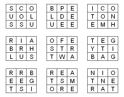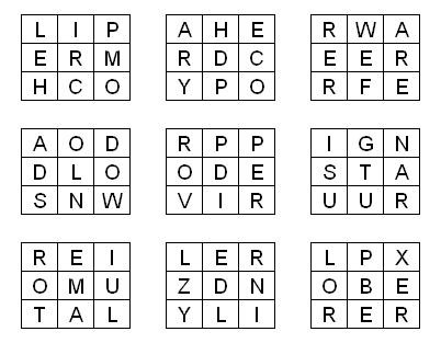In jedem Kästchen versteckt sich ein EDV-Begriff mit acht Buchstaben. Man kommt von einem Buchstaben zum Nächsten, indem man waagerecht oder senkrecht geht. Die neun restlichen Buchstaben ergeben nach dem gleichen Schema das Lösungswort.