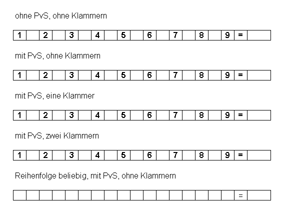 In den ersten vier Aufgaben ist die Reihenfolge der neun Ziffern vorgegeben. In der fünften Aufgabe soll eine optimale Reihenfolge ermittelt werden.