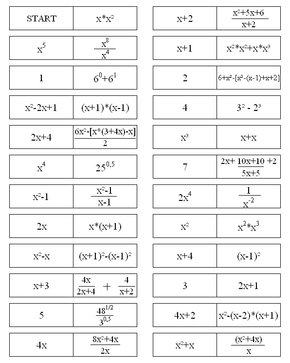 Die Dominokärtchen sind so zu legen, dass entsprechende Ausdrücke aneinander liegen. Gesucht ist der letzte Term!