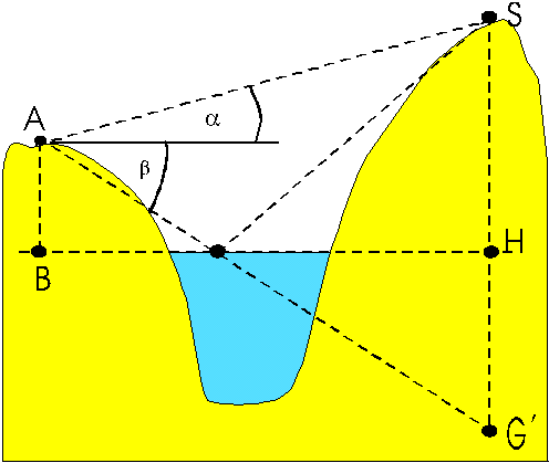 Ein Wanderer A, der sich 120 Meter über einem Bergsee befindet, sieht den Gipfel S eines Berges unter einen 36 Grad großen Höhenwinkel alpha, das Spiegelbild G' des Gipfels im See unter einem 43 Grad großen Tiefenwinkel beta.