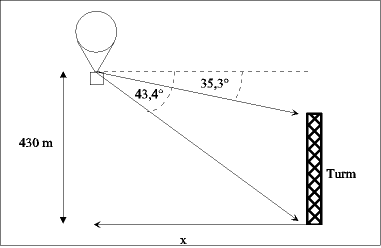 alpha=26,5° und beta=43,7°. AB=95,4m. Wie hoch ist der Turm (in Metern)?
