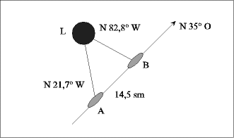 L unter dem Winkel N21,7°W an. Nachden das Schiff 14,5 sm gefahren ist,