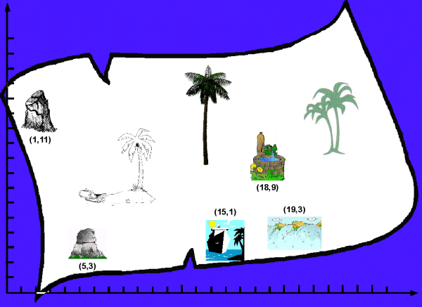 Auf der Koordinateninsel gibt es fünf auffällige Punkte: Baumstumpf (1,11), Brunnen (18,9), Felsen (5,3), Wasserfall (19,3) und Hafen (15,1). Eine Koordinateneinheit entspricht 100 Metern. Auf der Insel sind sechs Schätze vergraben. Die Koordinaten sind rechnerisch zu bestimmen. |